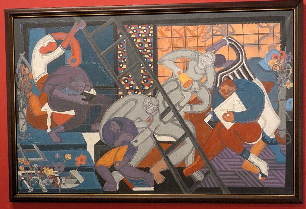 The ladder that runs across the painting’s centre was reminiscent of a feature of two of the paintings in the Sussex Modernism exhibition that I commented on in my last blog post, a future-oriented movement at their centres. In the central panels of A Better Life For All, from the International Workers Mural, a boat moves towards the rising sun and, we might assume, towards the hoped-for better life for all. In Campus, in which its painter, Julian Bell, reflects on knowledge, a bridge-like structure at the centre connects the campus to the Sussex Downs, which I saw as carrying knowledge from the university to the world beyond.